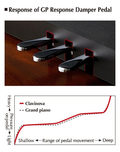 High-end models feature the GP Response Damper Pedal, which offers a grand piano-style resistance curve, starting out light to the touch and growing heavier as the pedal is depressed further. This allows players to become accustomed to the nuances of delicate pedaling.