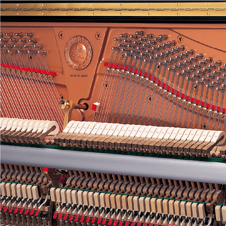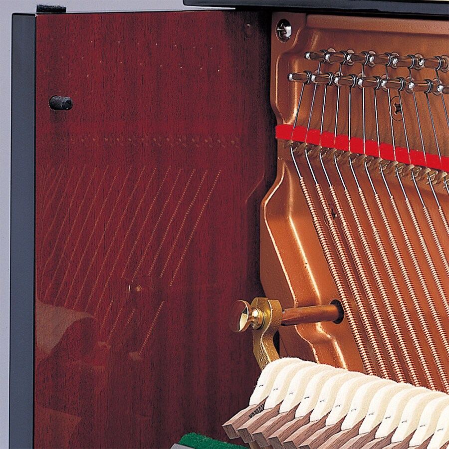 The SU7 is the only Yamaha upright piano that uses agraffe guides, which allow you to accurately determine the position of the strings and the effective speaking length of the strings for fixing the strings over the entire range of the instrument. As a result, string vibrations are cleanly and efficiently transmitted to the soundboard and frame, producing rich overtones and clear, agile sounds—unique to the SU7.