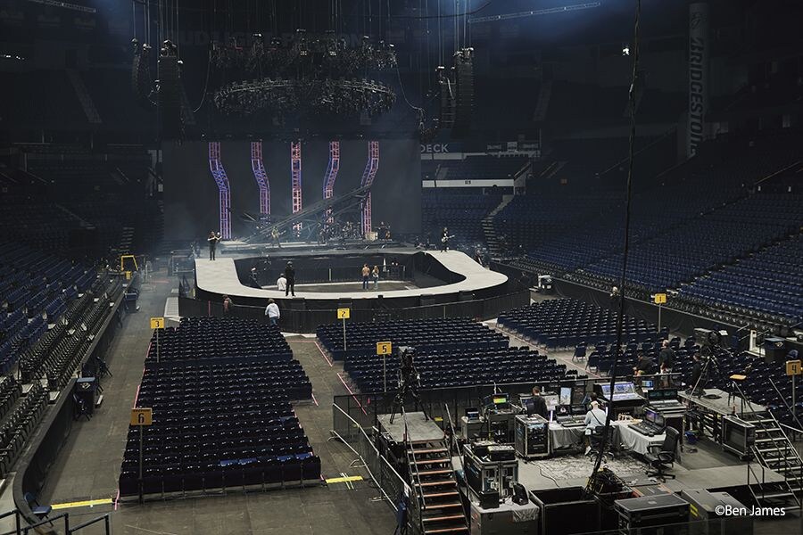 Esta gira introdujo un diseño de escenario particularmente complicado: un escenario en forma de herradura que envuelve el escenario alrededor de la audiencia. Esto permite actuaciones íntimas, pero introduce serios desafíos sonoros. "Esas conversaciones comenzaron con meses de antelación", recuerda Loy. "Realmente queríamos averiguar cómo lograr que la voz, que es la fuente más importante del espectáculo, sonara limpia y clara sin un montón de productos PSE [realzador de fuente primaria] en ella, o tener que atenuar frecuencias tan agresivamente que no quedaran agudos (HF).”