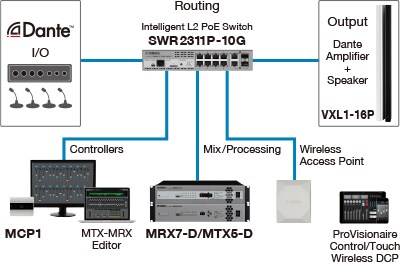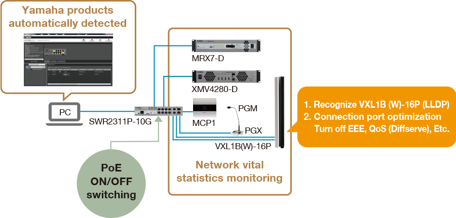 El VXL1B-16P y el VXL1W-16P son compatibles con la red de audio "Dante", y utilizan una configuración line-array delgada, lo que los adecúa perfectamente a salas de conferencias (en un rango de tamaño de 12m × 10m) que exigen claridad vocal, imponen numerosas limitaciones de espacio, y requieren funcionalidad y un sentido de diseño. Con el audio distribuido a través de una red Dante y PoE power* suministrado desde un conmutador L2 compatible con PoE, el sistema de altavoces puede construirse como una red, lo que permite que la infraestructura existente de TI se utilice de manera efectiva. El cableado a través de cables LAN es simple, la instalación es fácil y no necesita un amplificador de potencia, lo que contribuye a la flexibilidad de instalación y permite construir un elegante sistema de sonido que no interfiere con el diseño de la sala de conferencias.