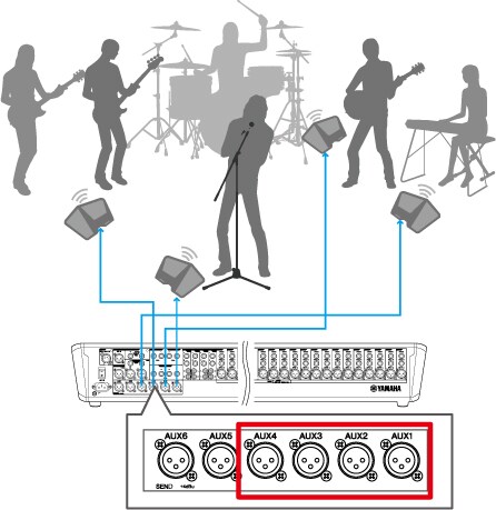 (Si utiliza altavoces pasivos, el aux send se conectará al amplificador que está alimentando el altavoz. )