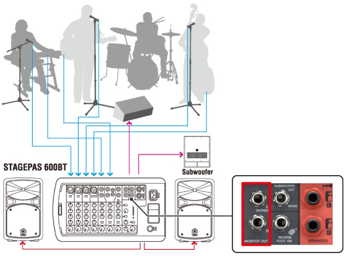 Conecte la SALIDA DE MONITOR (MONITOR OUT) desde la mezcladora a los altavoces usando cables de línea o cables XLR.