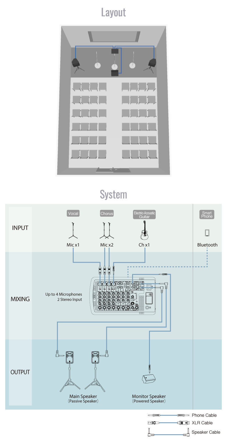 Conecte fácilmente su dispositivo inteligente a través de Bluetooth a Stagepas para usarlo como su fuente de sonido. No es necesario estar junto a la mezcladora, puede controlar el volumen directamente desde su dispositivo inteligente donde sea que se encuentre dentro de la habitación o el lugar.